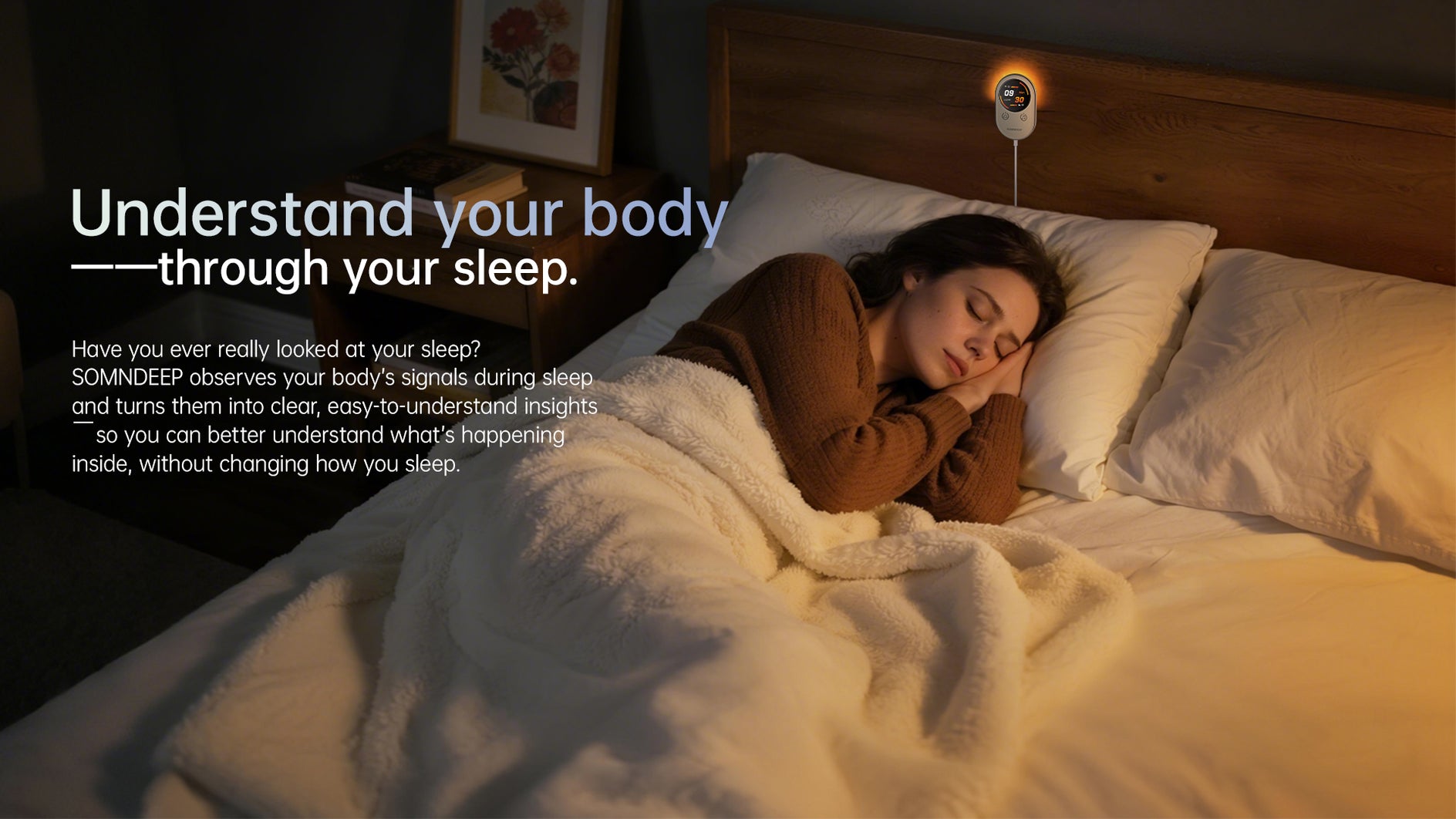 Physiological signals are most stable and meaningful when the body is at rest. By focusing on sleep, SOMNDEEP continuously observes key nighttime indicators and turns them into clear, relevant insights — not scattered or overwhelming data.